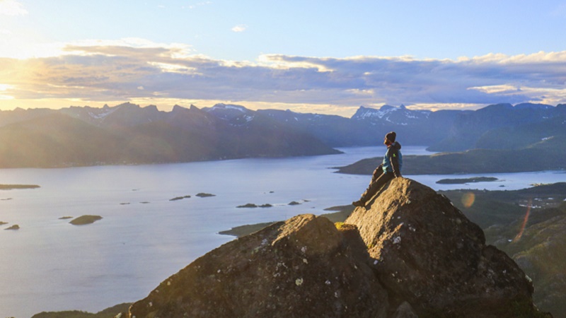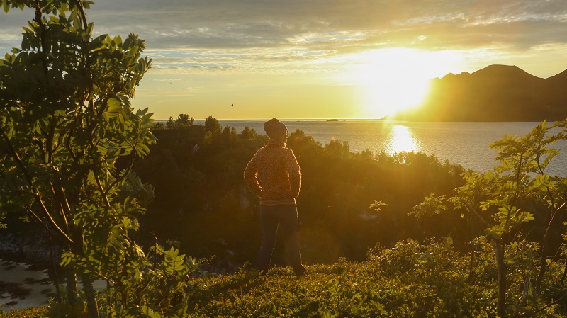 Tannkosten får vente, jeg spenner på fjellstøvlene og lar søvnen seile sin egen sjø. Fjellet kaller. Sukkertoppen ruver 456 meter opp fra havet, halvannen times bratt vandring fra Hamn. Foruten et par skarv på fisketur og en havørn i det fjerne, er det ikke en annen sjel i sikte. Jeg setter meg ned og lar humla suse. Sola gløder, klokka viser 02:14. Dette er sjelefred.