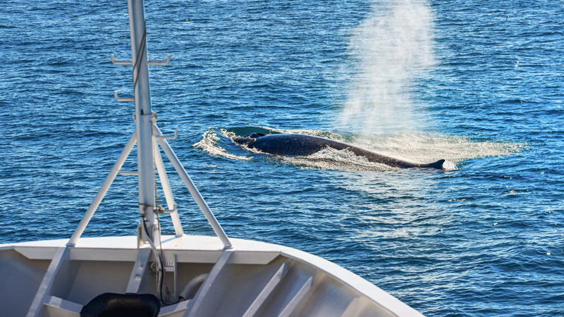 Etter et kvarters show, med kunstferdige hopp og hyppig blåsing, syns hvalen det er nok, og tar seg en tur i dypet. Siden kommer også en finnhval langs skutesiden, og viser oss ryggen av sin rundt 20 meter lange kropp. Imponerende!