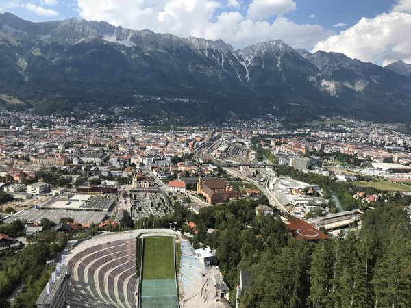Så har vi fått både åndelig og legemlig føde og er klare for nye opplevelser. Turen går så til hoppbakken Bergisel. Mange nordmenn har sittet foran TV’n og ventet i spenning på at de norske hopperne skulle ta medalje her. I Bergiselbakken satte Birger Ruud bakkerekord med 74 meter, i 1933 da Norge ikke deltok i VM. Vi må selvsagt til topps, og nyter en utsikt som kan ta pusten fra noen og enhver.