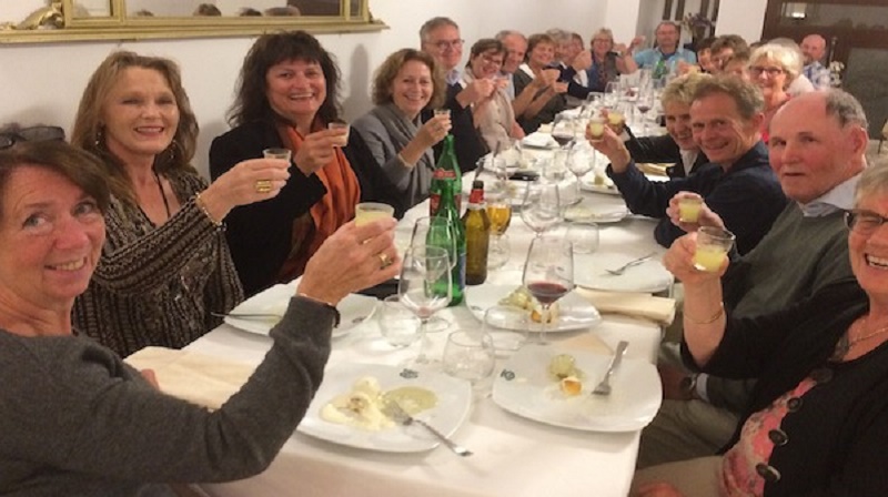 Og etter dagens gode vandringsslit, der kropp og muskler har jobbet mens sinnet har fått luftet seg, møttes til aperitif i hagen eller salongen på Hotel delle Palme (Palmehotellet).  Dette vakre, eldre hotellet i landsbyen Sant Agata  – nesten som en gammel dame med patina og litt falmet glans, men med tydelige spor av fordums skjønnhet.  Og etter boblene gått til bords og fått servert solid og velsmakende middag av et omsorgsfullt personale. Kjøkkenet i Sør-Italia er relativt enkelt, men med høy kvalitet på ingrediensene.  Så gjevt er det at Harrods i London hver morgen får flybåren mozzarella fra dette området!  I alle fall før viruståka senket seg.